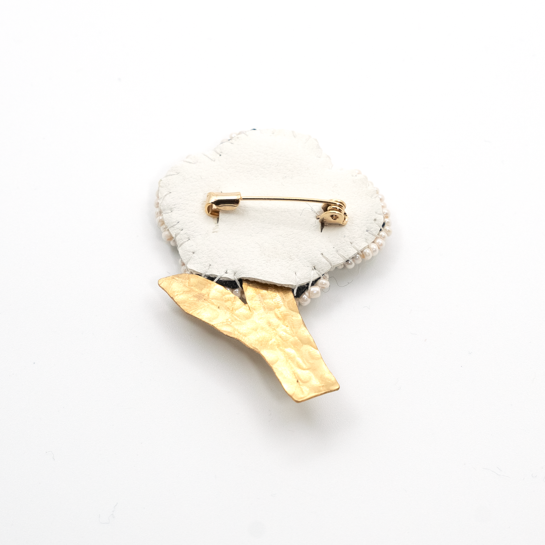 Soft wool embroidery and a hammered brass leaf come together in this monochrome flower brooch. A quiet, handcrafted accent that pairs beautifully with both black and white outfits.